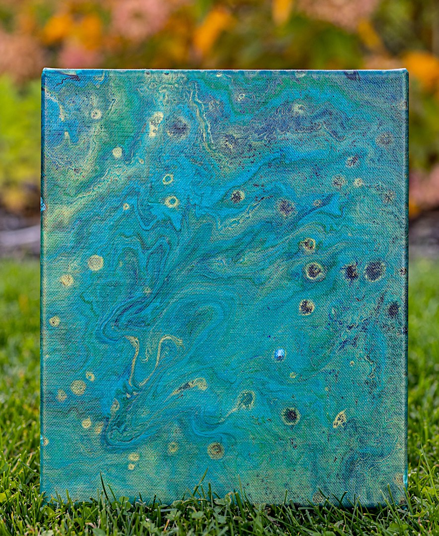 Blau und Grün sind die Hauptdarsteller in diesem Bild. Glanzvolle Effekte werden durch Goldtöne hervorgerufen, welche die Augen des Betrachters immer wieder an andere Stellen des Bildes lenken. Die Acrylfarbe wurde auf die Leinwand gekippt und anschließend verteilt.