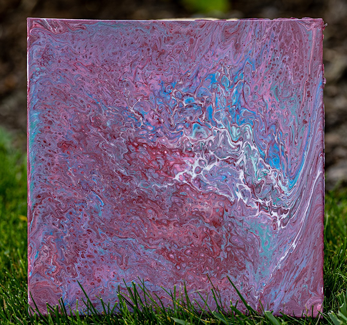 Warme Lilatöne werden von kühlen Blautönen unterbrochen und bilden ein einzigartiges Zusammenspiel. Die weißen Akzente durchbrachen das sonst harmonische Muster. Die Acrylfarbe wurde auf die Leinwand gekippt und anschließend verteilt. Obwohl es kein kleines Bild ist, wird es definitiv ein Blickfang und Gesprächsstoff werden bei Dir!