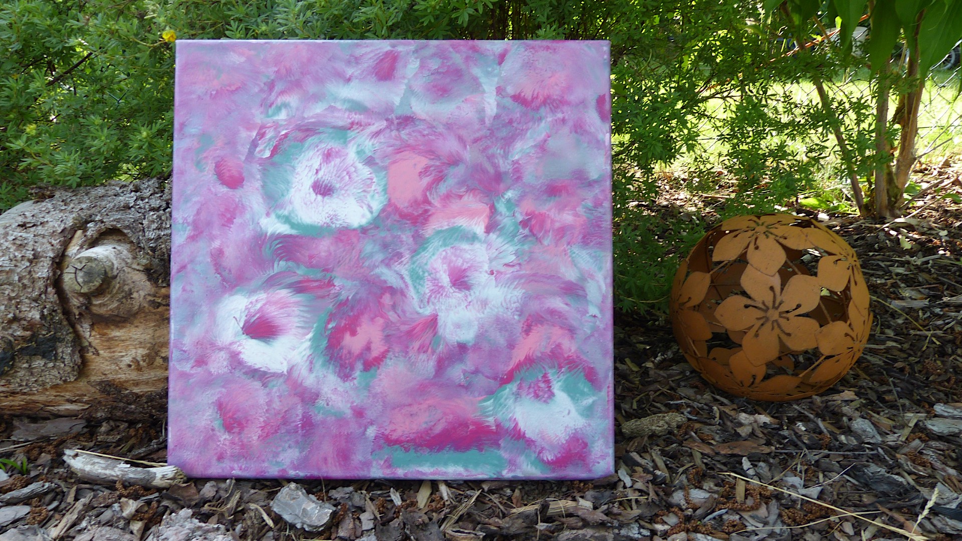 Für dieses Bild wurden Farben auf eine Leinwand gekippt und anschließend mit einem (aufgeblasenen) Luftballon verteilt Die gewählten Farben (Lila, Rosa, Hellgrün und Weiß) und die genutzte Technik ließen einen blumigen Effekt entstehen. Man möchte meinen, man riecht die Blumen beinahe…